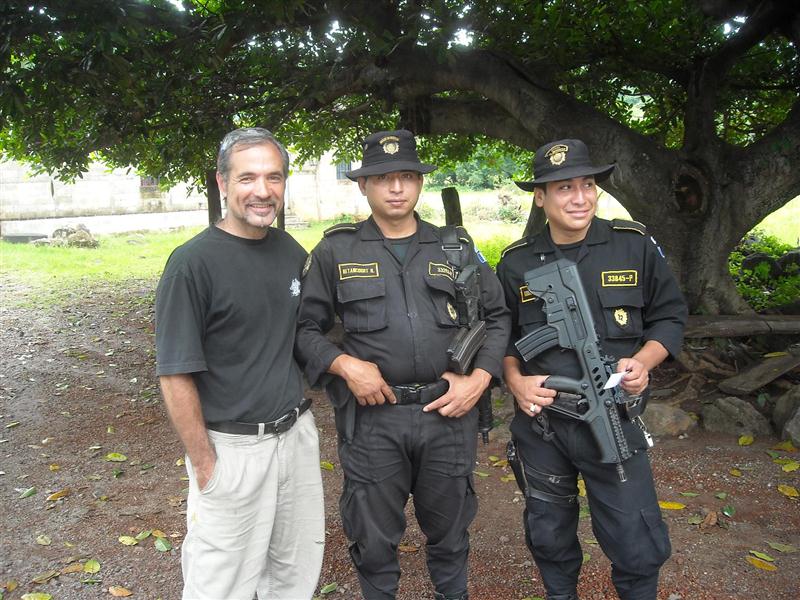 Me levanté temprano y empecé a preparar mis cosas, la ropa que había lavado la agarró la lluvia , así que tuve que poner todo mojado adentro de una bolsa. A eso de las 7am llegaron puntuales Armando y Antonieta en su Vulcan 750. Me acompañaron un rato y alcanzó para despedirnos, pero no para agradecerles lo bien que me han tratado, gracias. Salí al rato con rumbo a la frontera, estaba bueno el tiempo, me paró un par de veces la policía, el trámite fué sencillo, y antes del mediodía ya estaba en Guatemala. en la frontera traté de comunicarme con Chochobolocho, pero había teléfonos público con tarjeta, pero nadie vendía tarjetas. Me fuí hasta el pueblo más cercano, en realidad llegué a un pueblo y debí detenerme porque había desfile de carrozas por la fiesta del pueblo. Estacioné en una estación de servicio llena de borrachos y estudié el panorama porque enfrente había un lugar desde donde podía llamar. Ví a un señor con un arma en el cinto y pensé que sería de la seguridad de la gasolinera, pero después ví que todos estabam armados y me gustó menos. Así que cuanto antes saliera de allí mejor y me fuí a llamar a Jorge Aragon. él había tenido un problema familiar pero inmediatamente me devolvió la llamada otro amigo llamado Roberto, combinamos para encontrarnos en el Puente de los Esclavos, y yo estaba a sólo 30km así que arranqué rápido de ese lugar pero seguí despacio, pasé dos controles policiales y como no me paraban al tercero paré yo y les pedí sombra. Me quedé un ratito a charlar, fumar y sacarnos fotos y seguí viaje. Dos kilómetros antes de llagar al puente apareció Roberto en su BMW, y lo reconocí porque clavó los frenos y dió la vuelta. Paramos a tomar algo fresco, se largó a llover, hicimos un poco de tiempo, y me llevó hasta su casa, donde todos me recibieron muy bien(y pude secar mi ropa). No tuve tiempo ni de bañarme, nos subimos al auto, pasamos a buscar a otro amigo, Favio, y salimos para Antigua Guatemala, la ciudad vieja. Allí sacamos unas cuantas fotos, me invitaron una mezcla de cerveza, salsa inglesa, tabasco y no sé que más, comimos algo y no me dejaron pagar. Al salir de allí se cortó la luz y en el medio de la oscuridad perdí un tornillo de mi trípode, pero lo encontramos con la ayuda de gente que se paró a alumbrar con sus teléfonos. Volvimos a la casa de Roberto, me conecté un rato a Internet y nos fuimos a dormir.